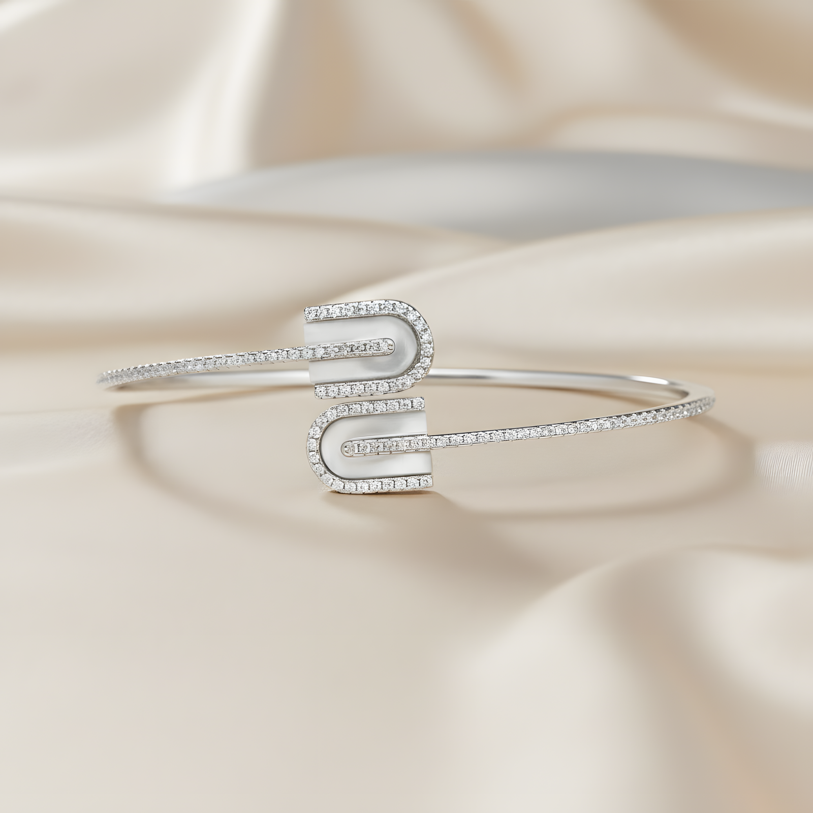 A sophisticated bypass-style bangle featuring two pavé-set “U” motifs that meet in the center. The entire band is encrusted with brilliant-cut diamonds for a seamless, shimmering finish.