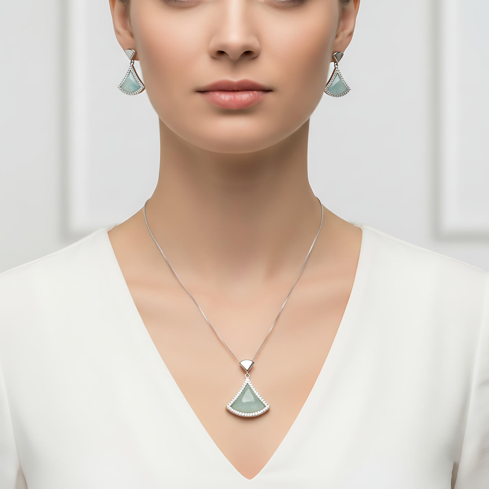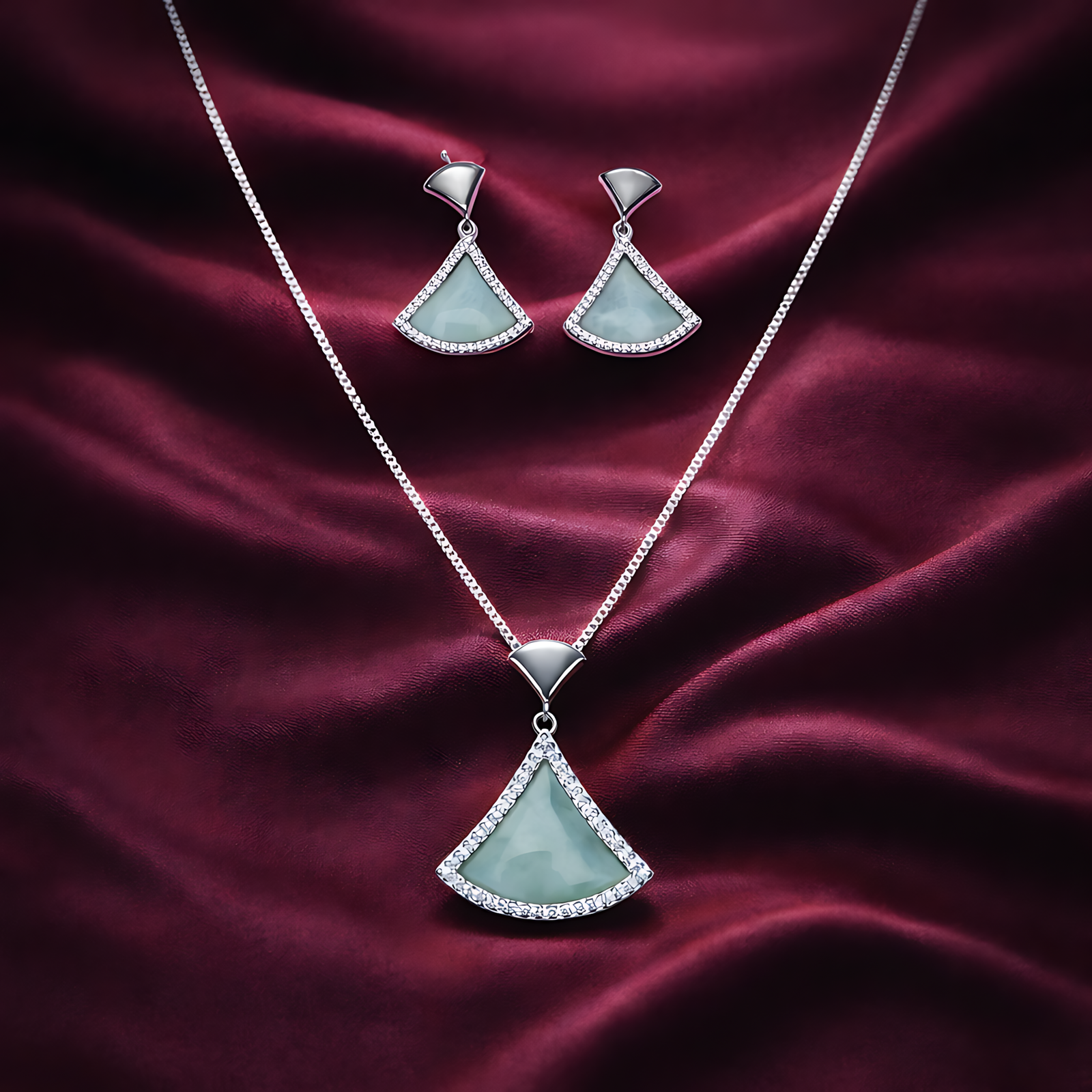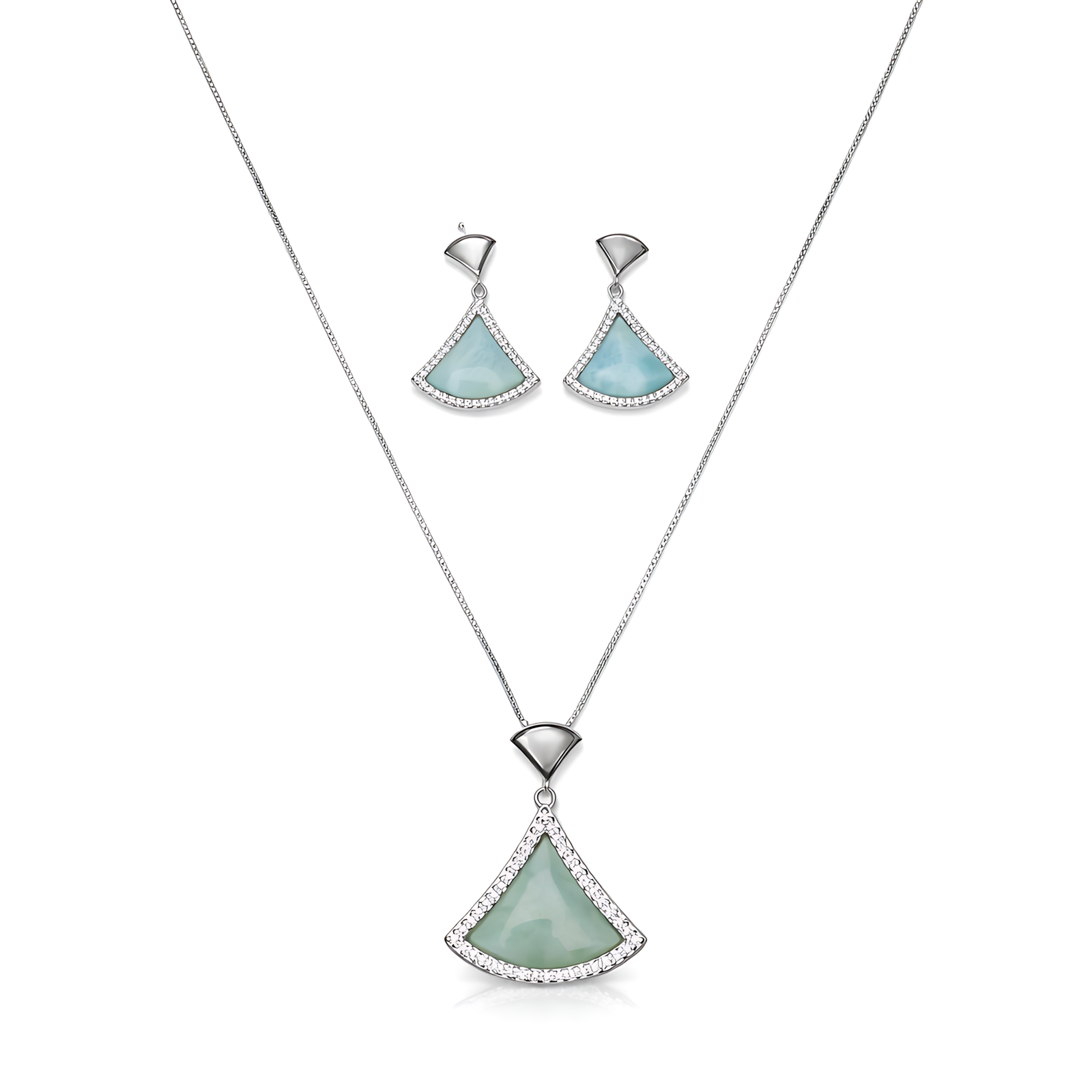 A bold, fan-shaped Larimar statement set in a shimmering pavé frame. Elegant, architectural, and timeless.