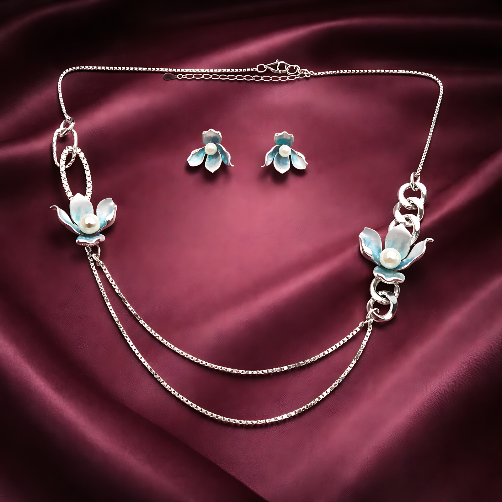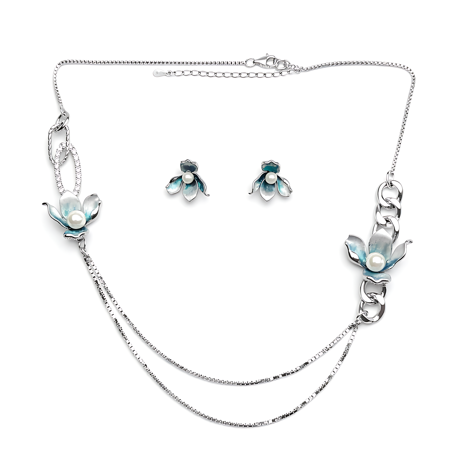 A multi-texture silver set with gradient blue enamel flowers and pearl accents. Features a distinctive asymmetrical chain for a high-fashion look.