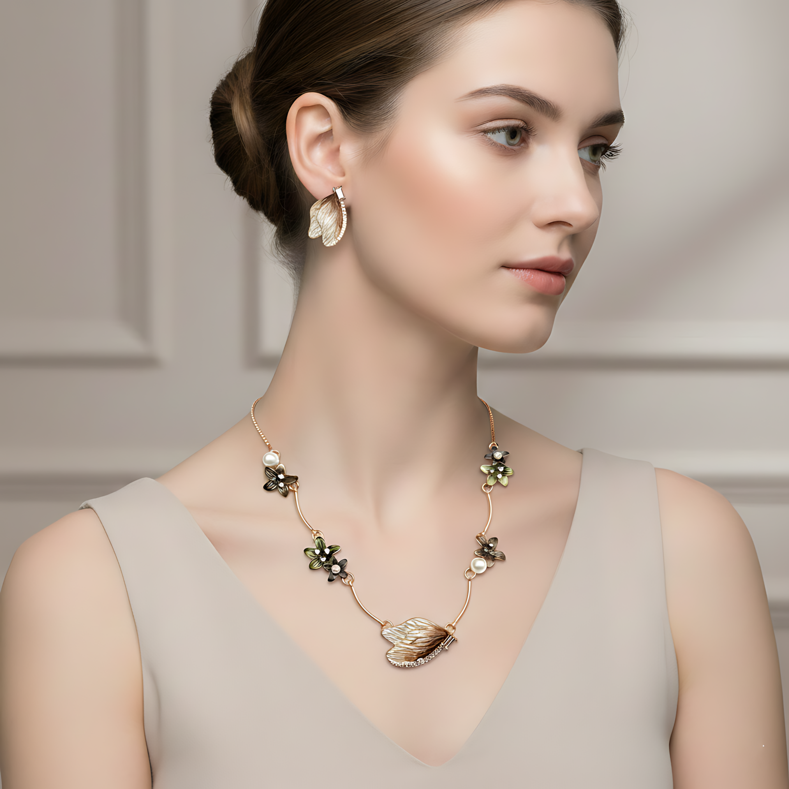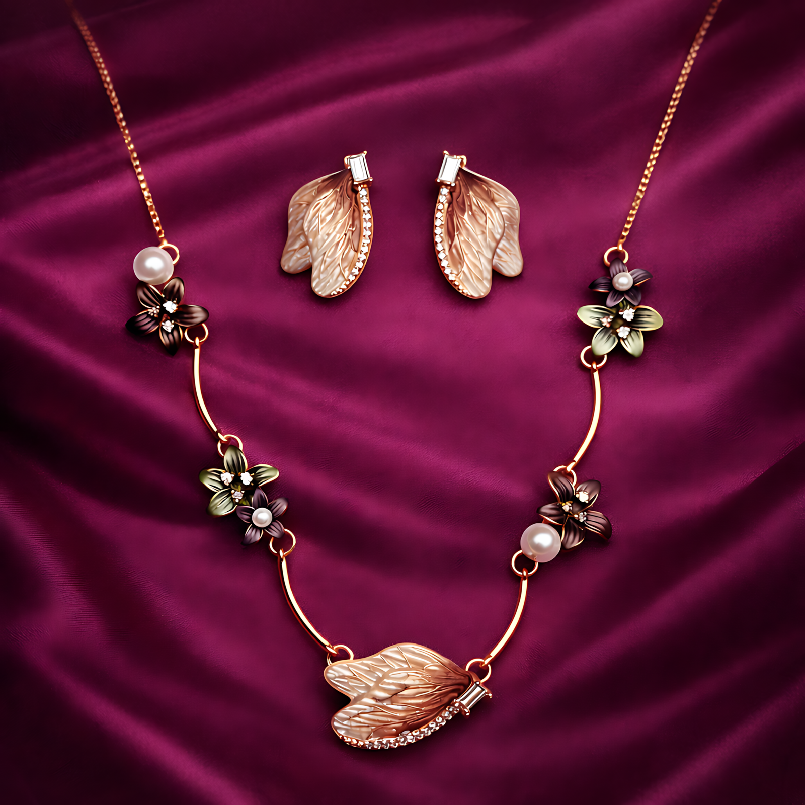 A warm gold-tone necklace set featuring delicate metallic leaf charms and petite pearl accents along the chain.