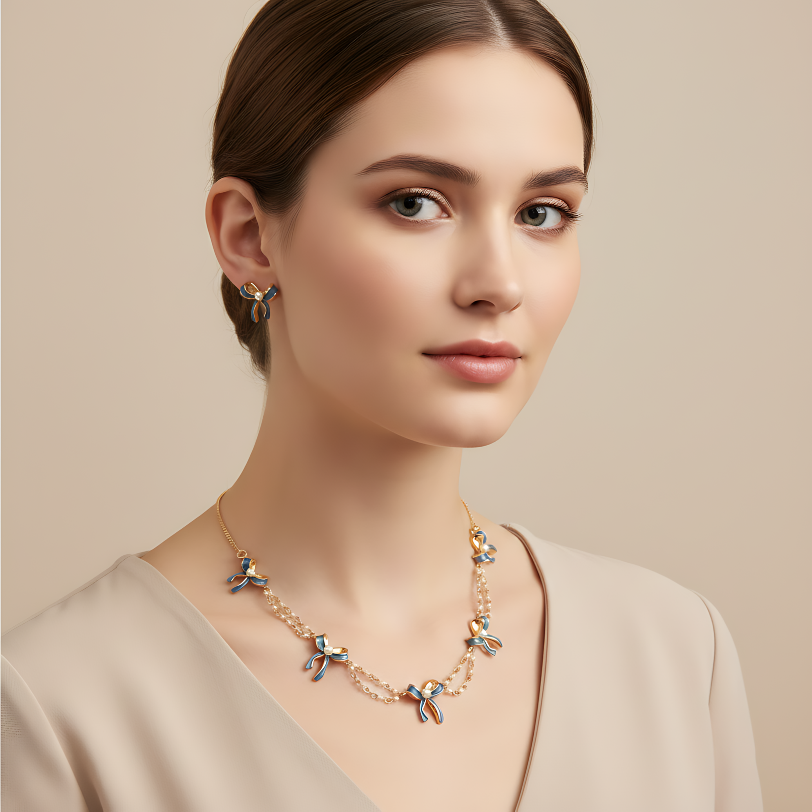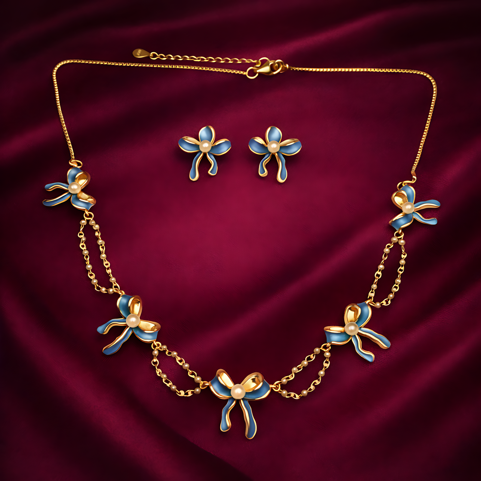 A dainty gold-tone necklace set featuring blue enamel bows and petite pearls on a layered chain.