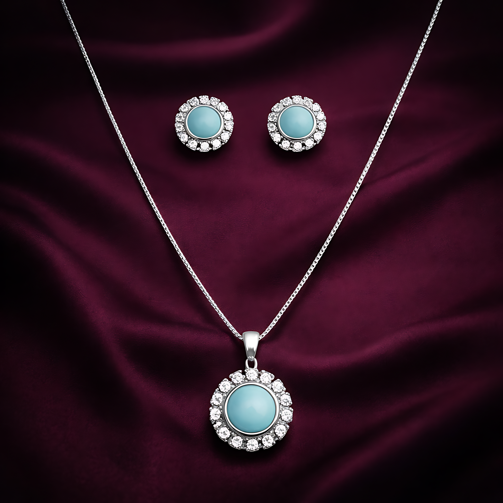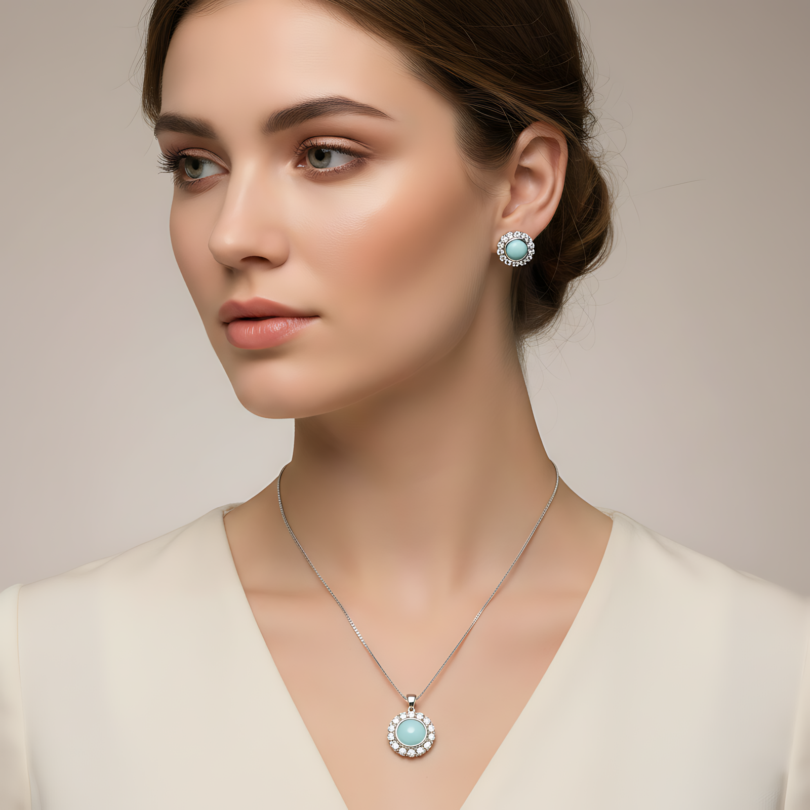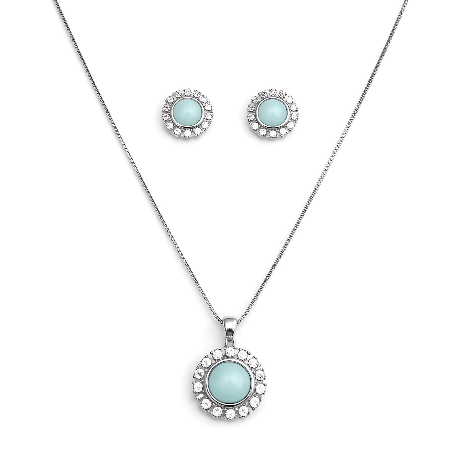 A classic necklace set featuring smooth sky-blue stones surrounded by a ring of brilliant crystals for a timeless look.