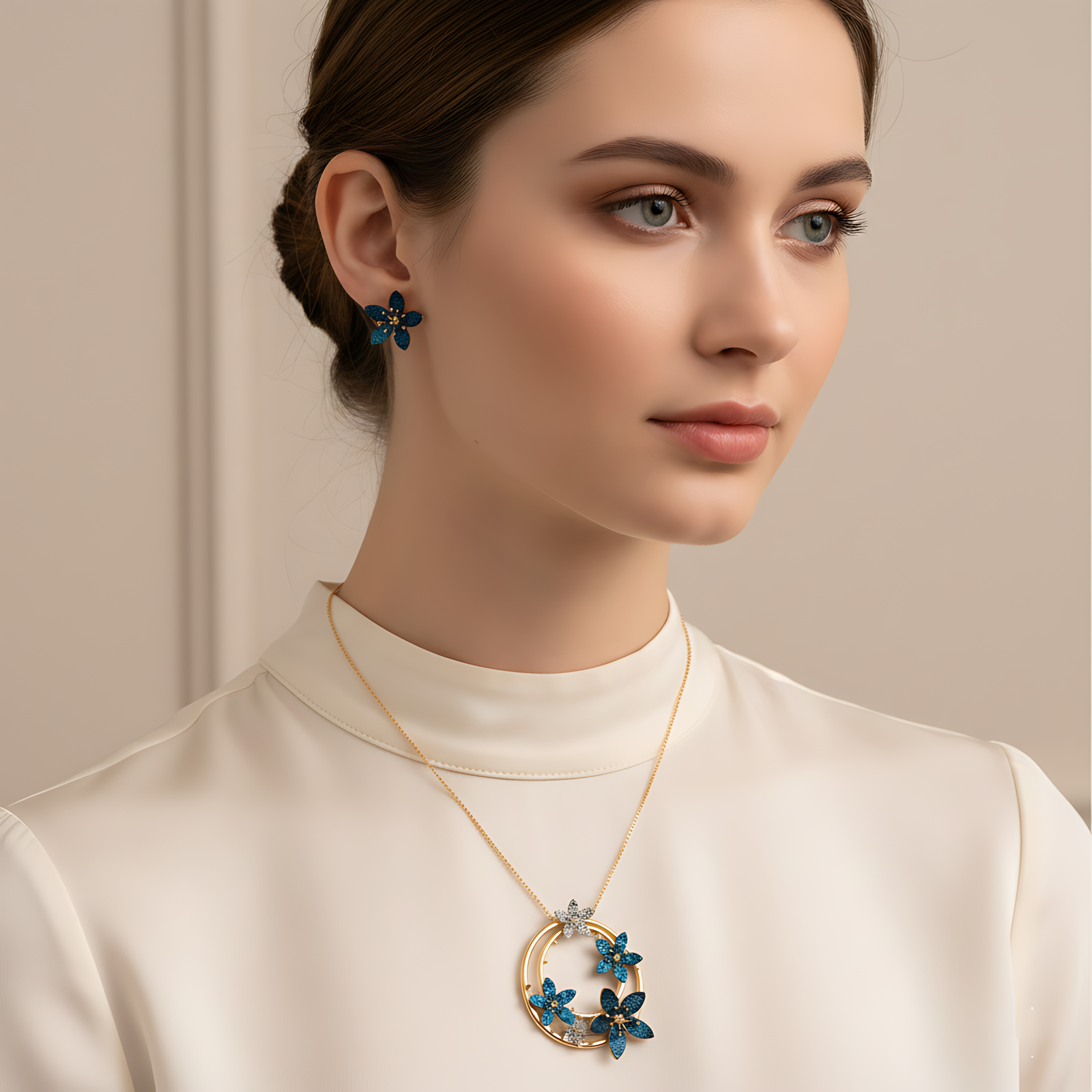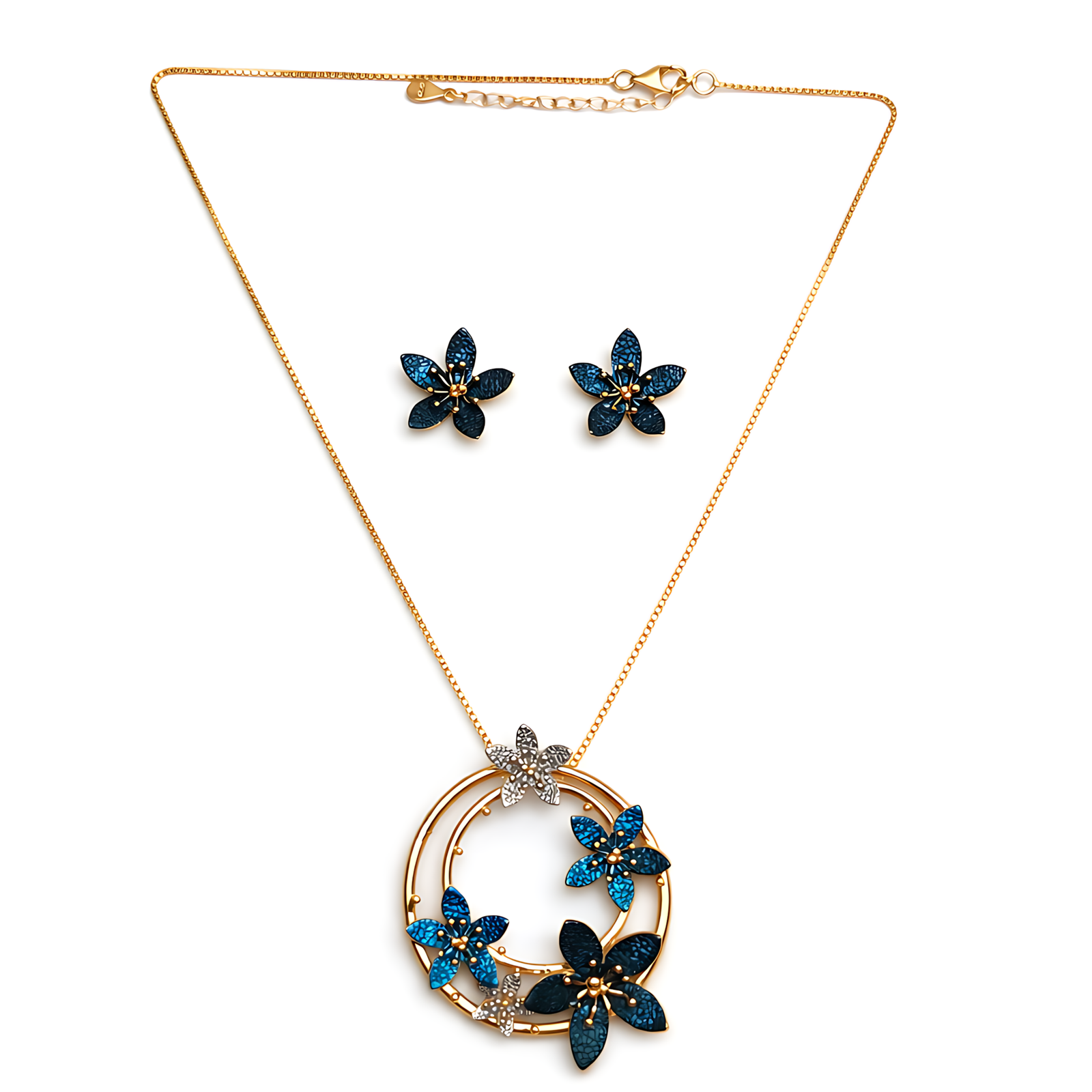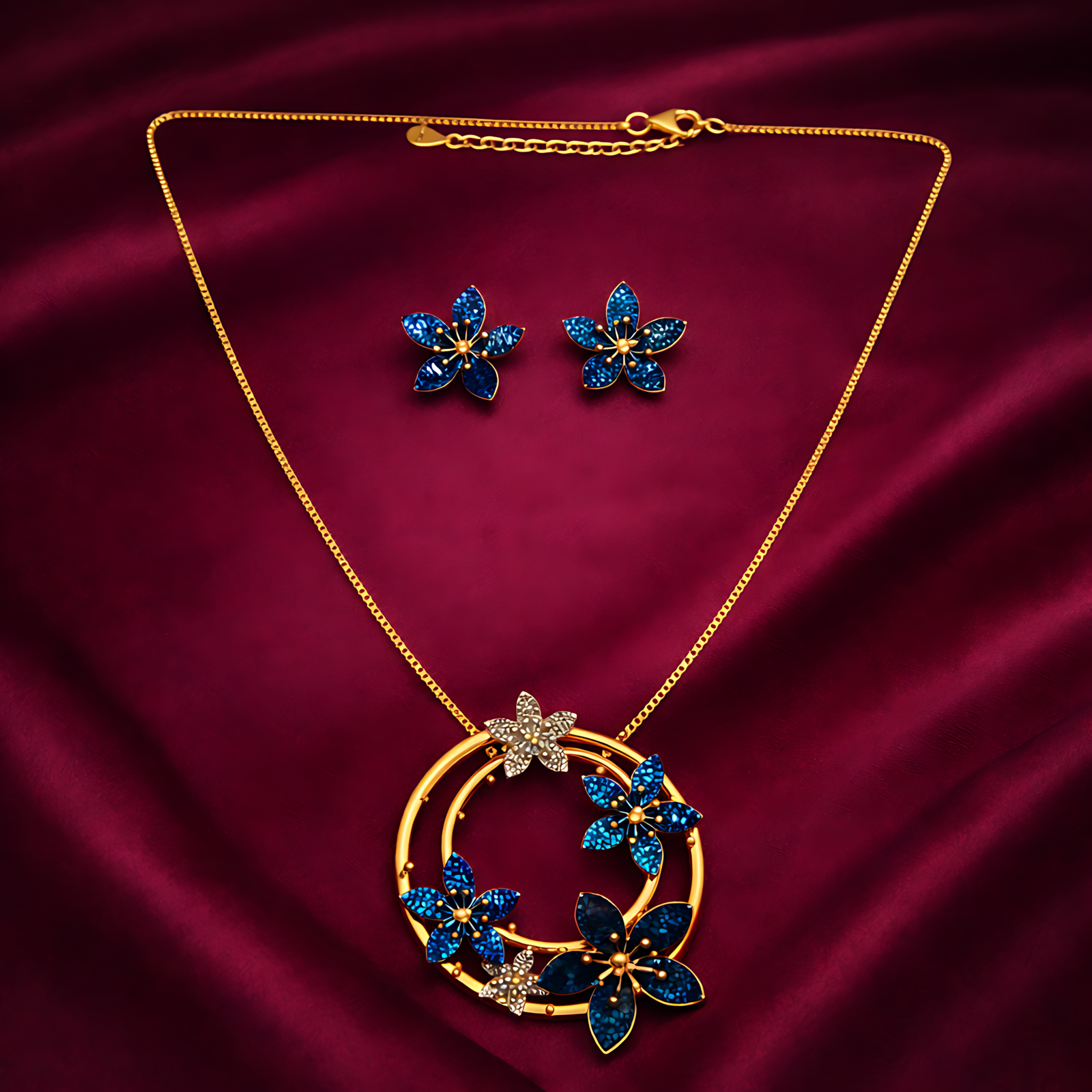 A radiant gold-tone necklace set featuring a circular pendant entwined with shimmering blue crystal flowers.