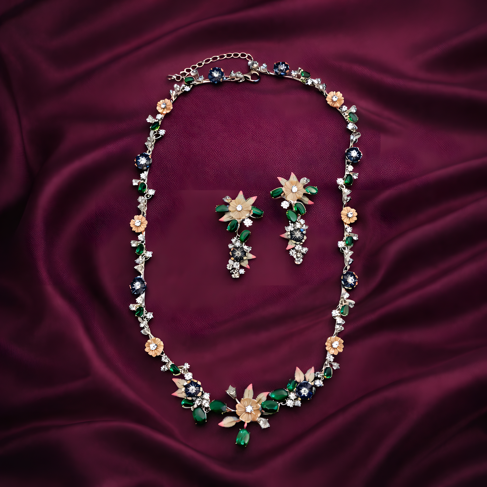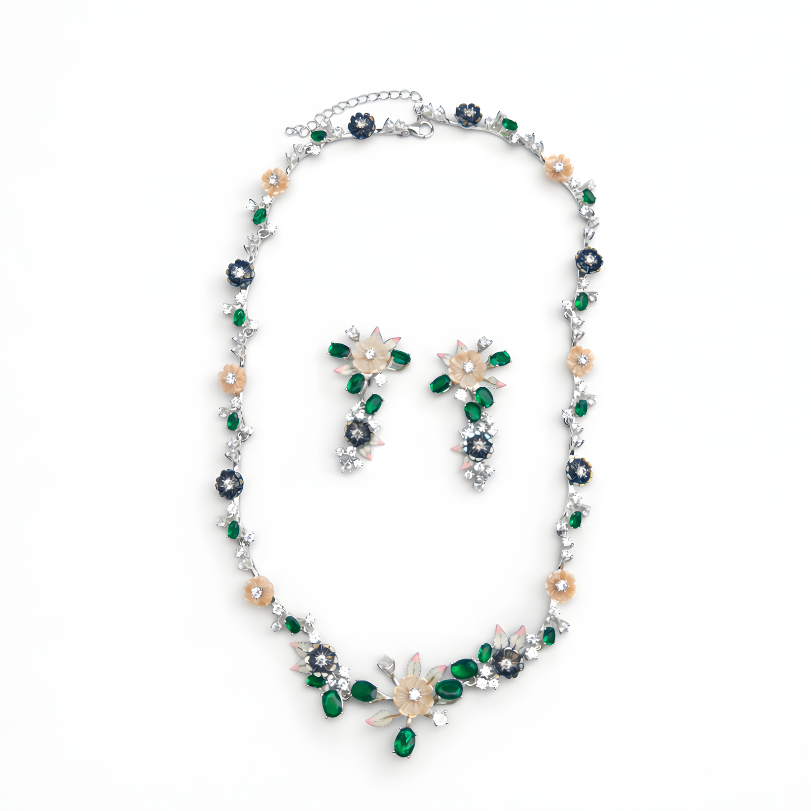 A sophisticated necklace set adorned with green stones, cream flowers, and silver accents.