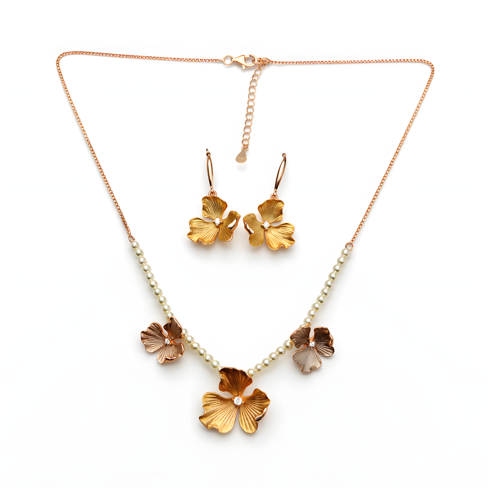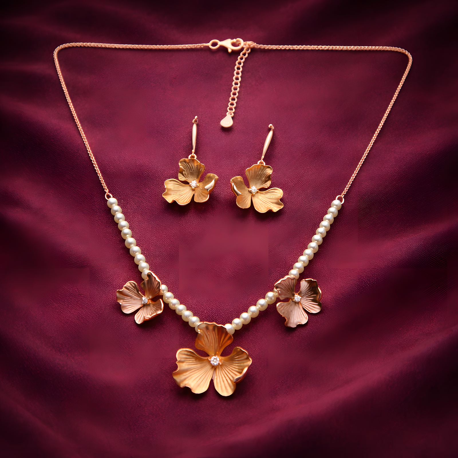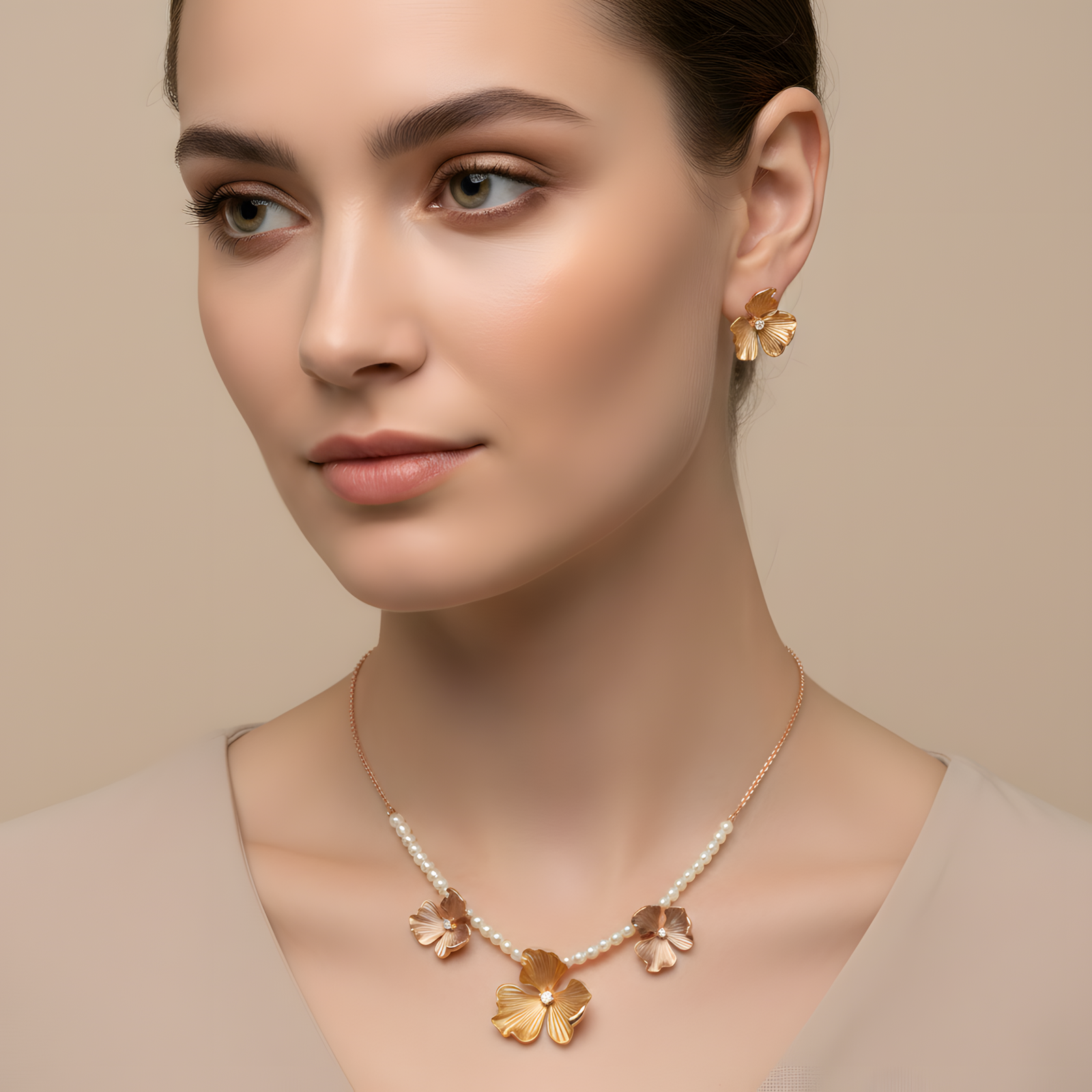 A radiant gold-toned necklace set featuring textured metallic flowers on a pearl-accented chain.