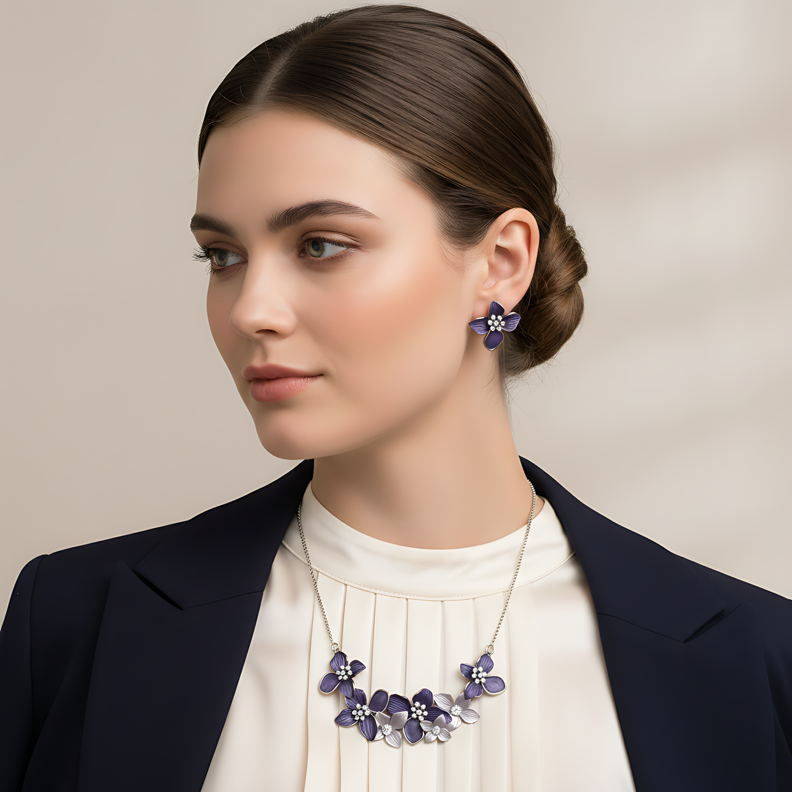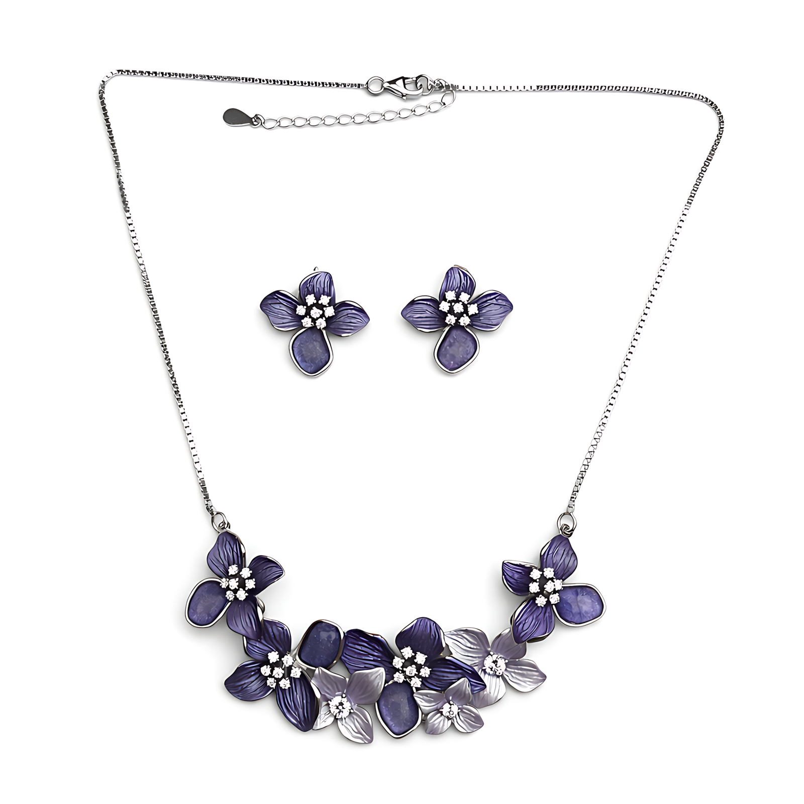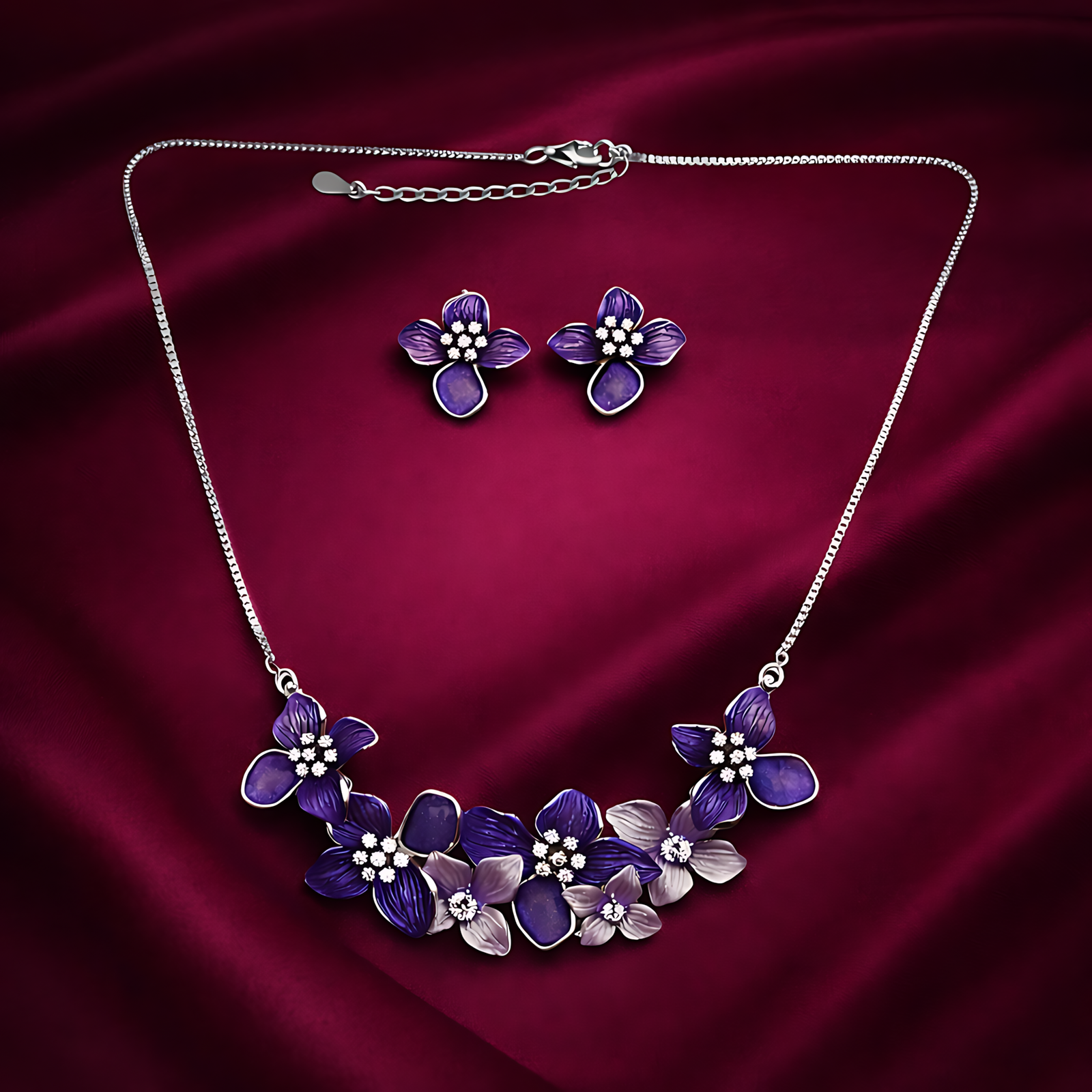 A sophisticated silver necklace set showcasing a cluster of deep purple and metallic blossoms.