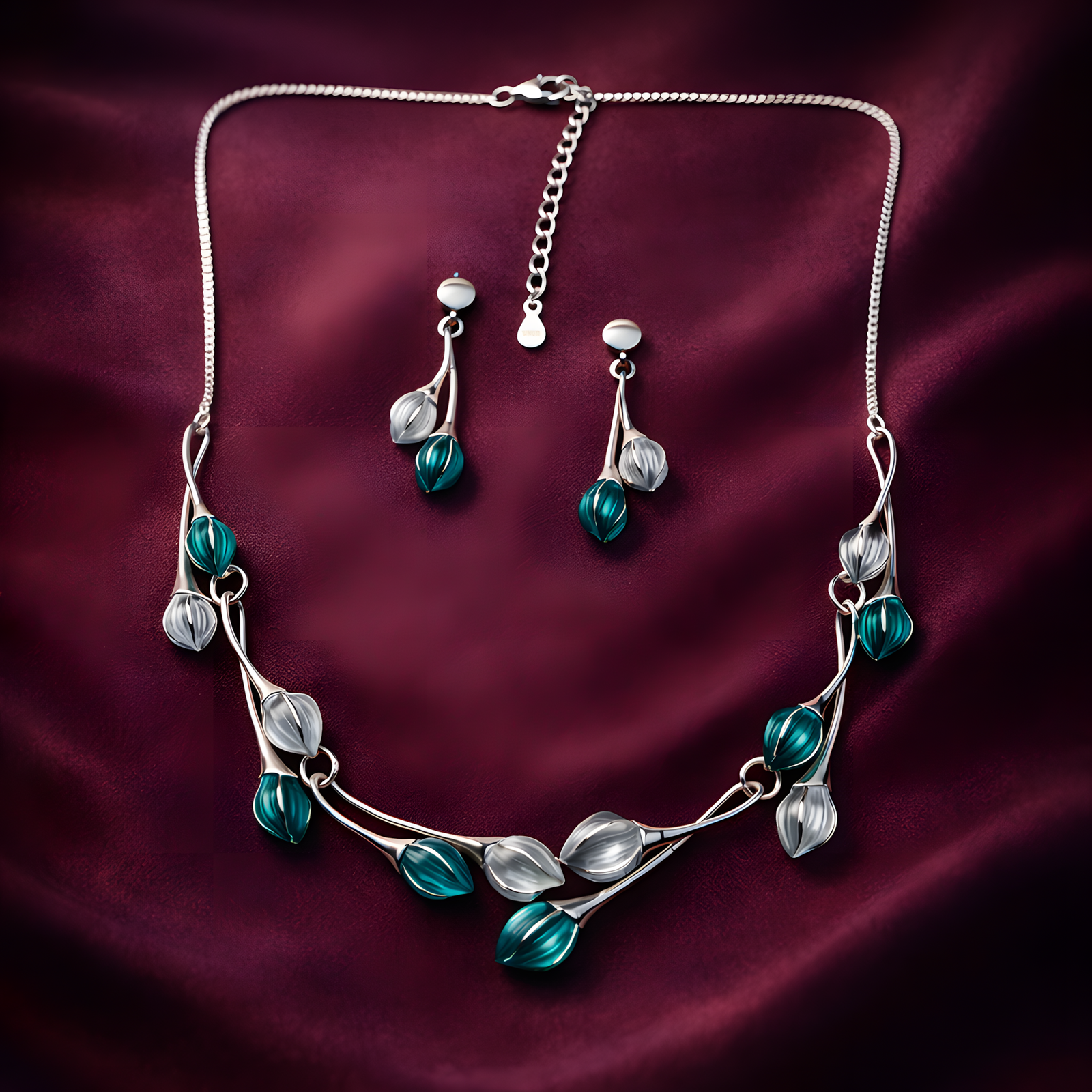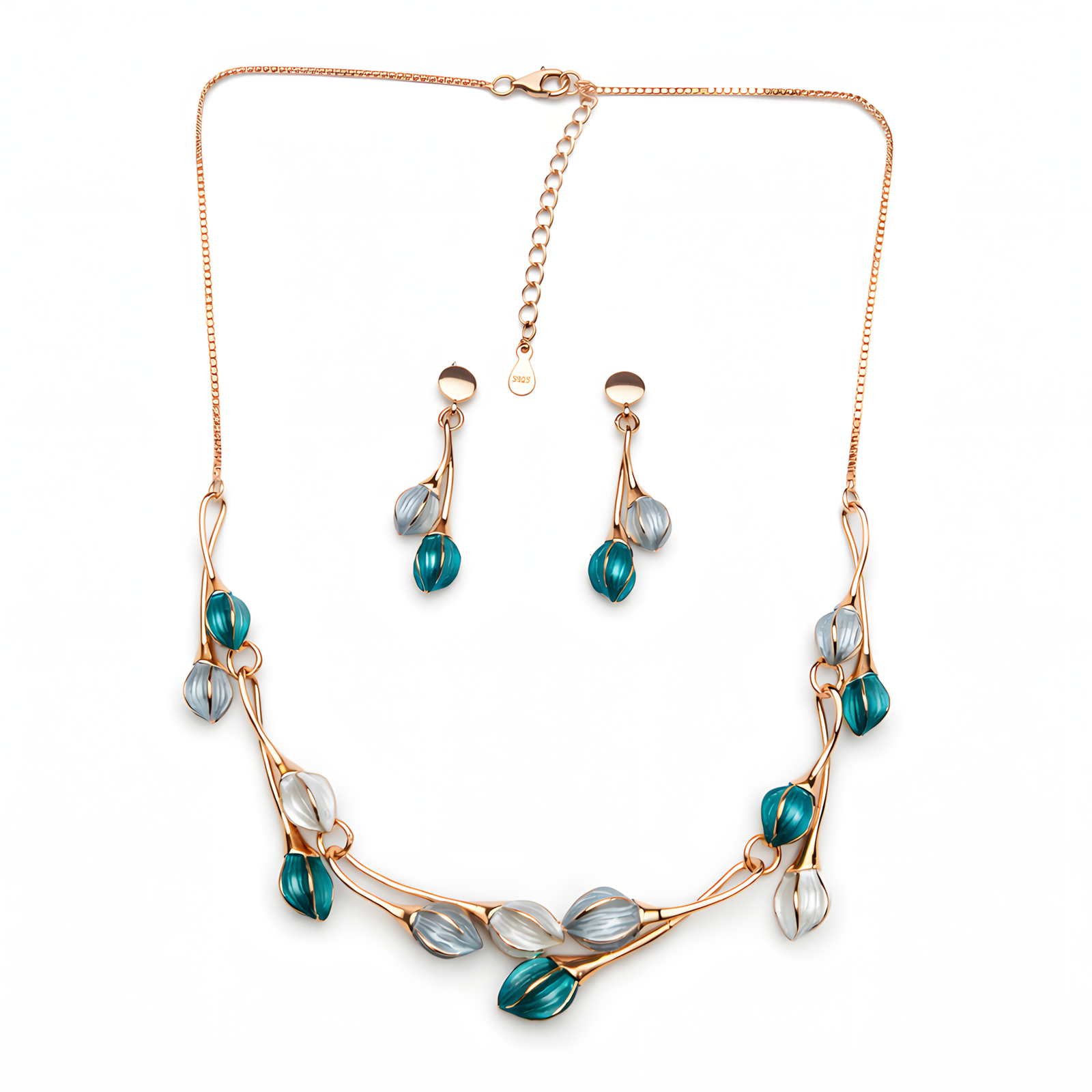 A warm gold necklace set showcasing a graceful branch design with vibrant teal and white leaves.