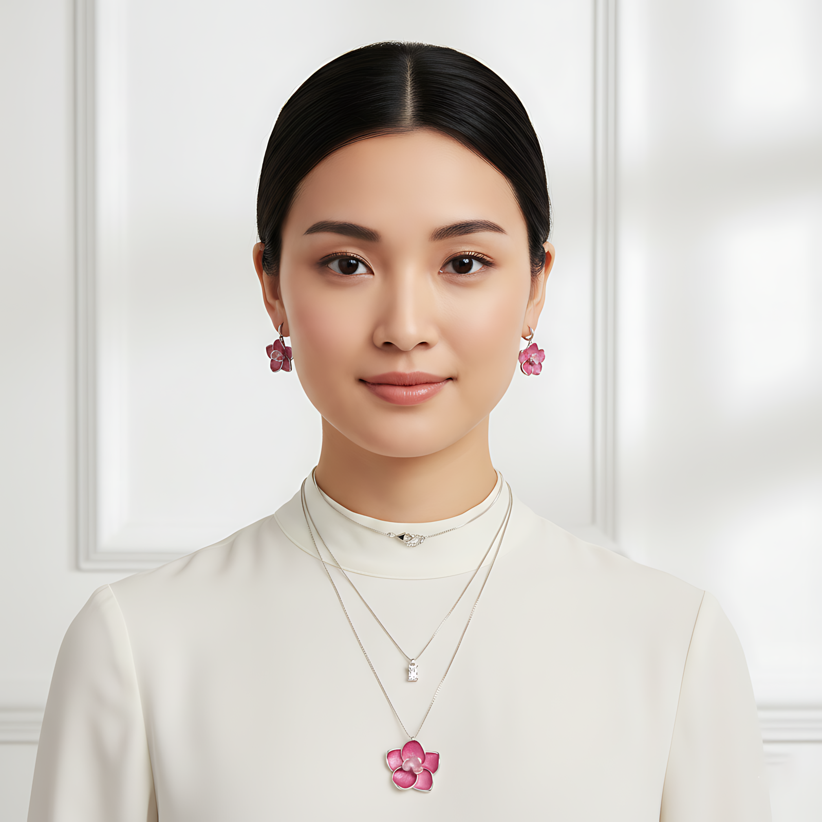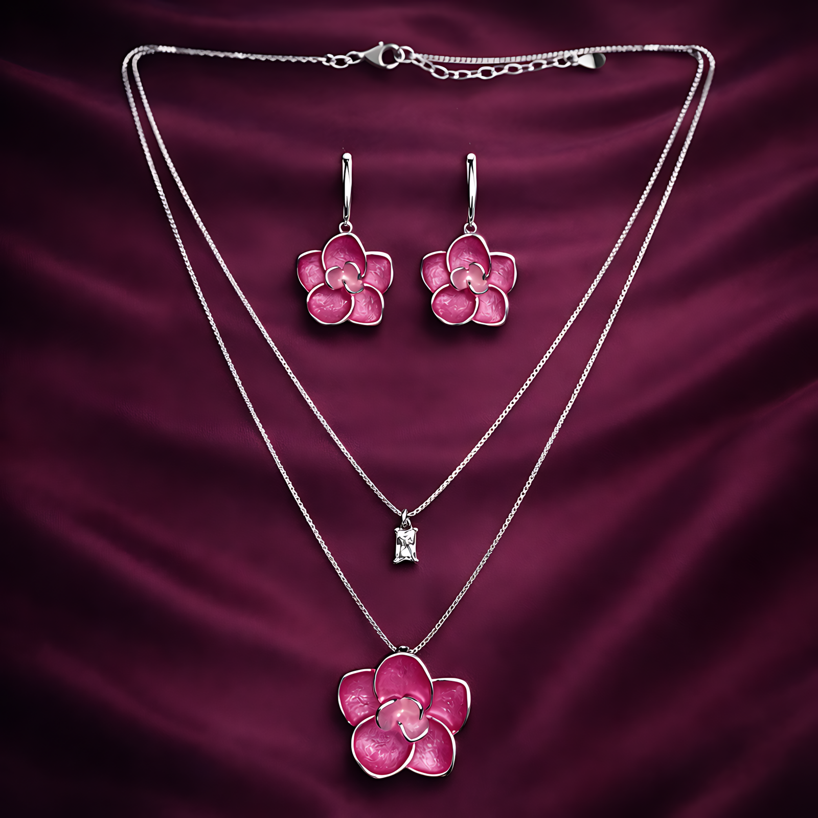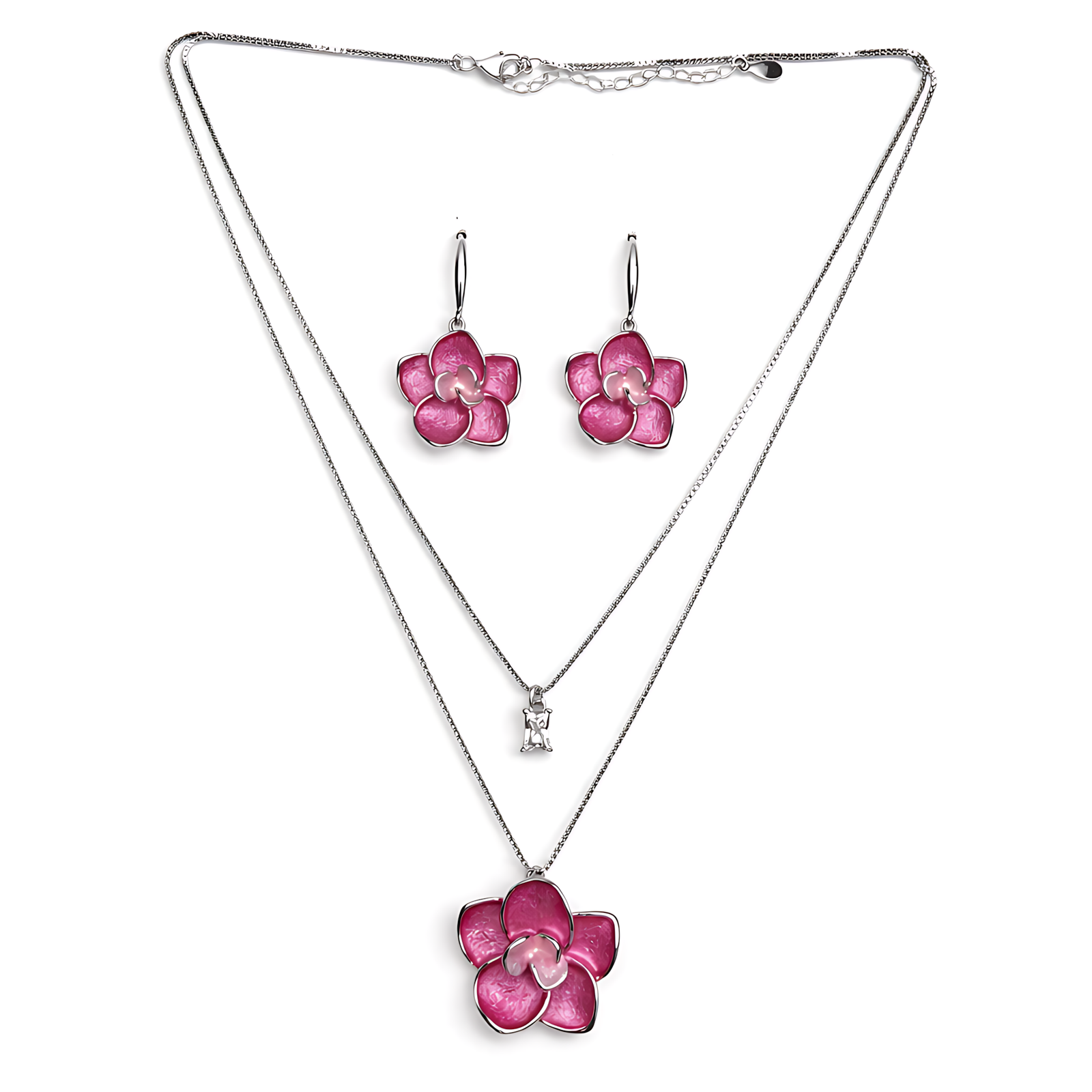 A layered silver necklace set featuring vibrant pink orchid charms and a subtle crystal drop.