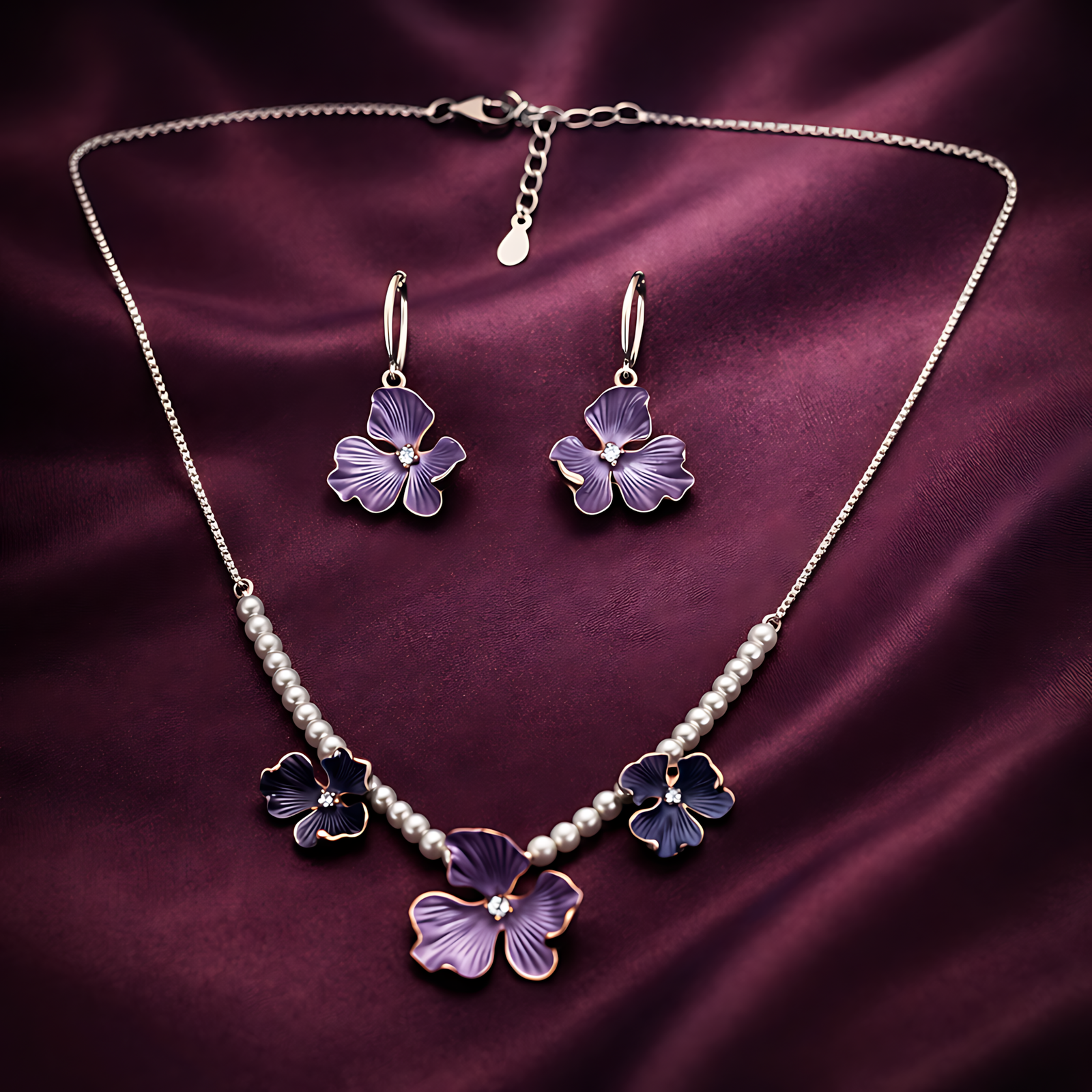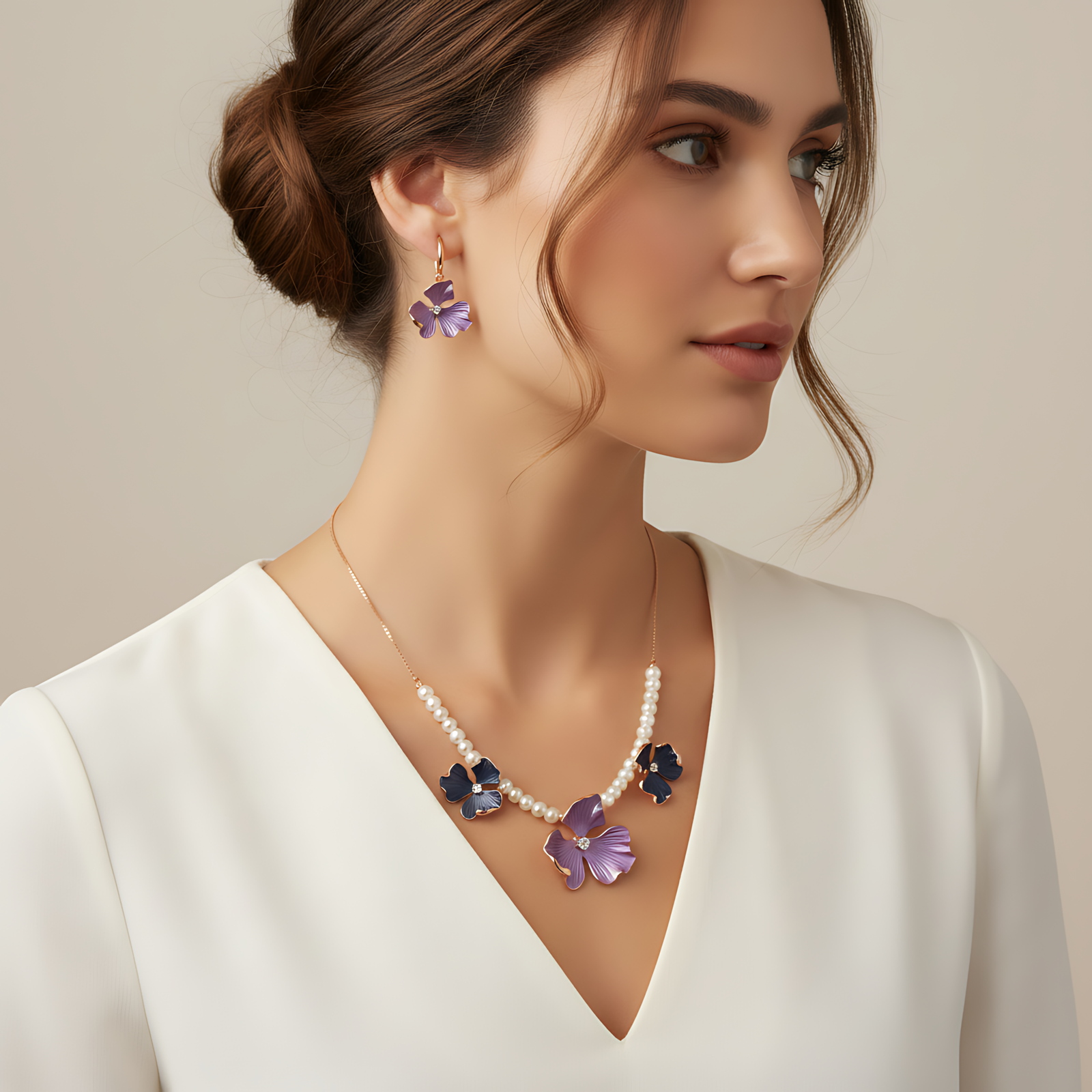 An elegant floral necklace set with purple enamel flowers and a delicate pearl-beaded chain.
