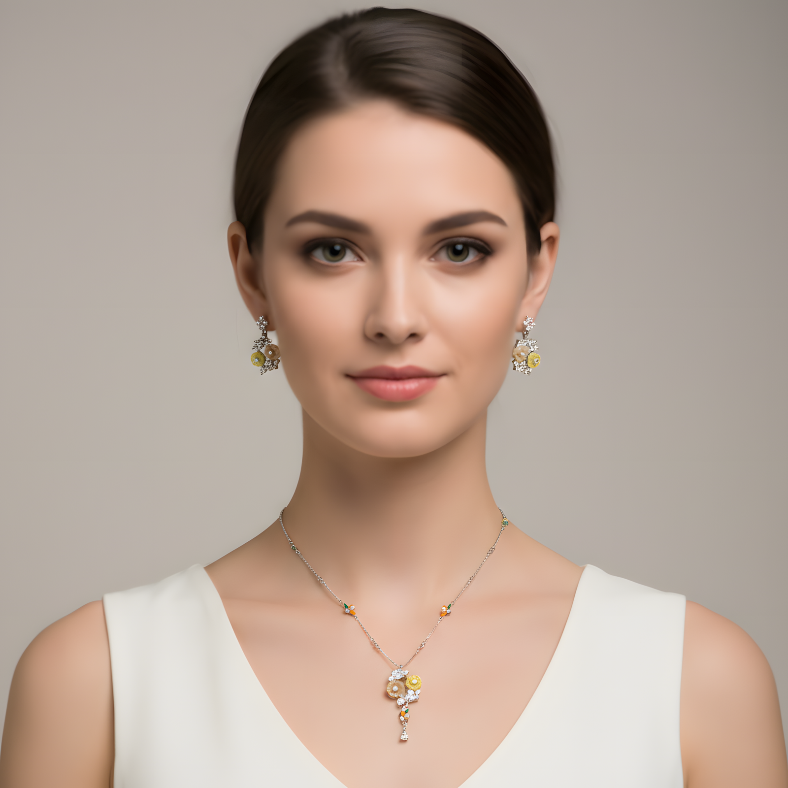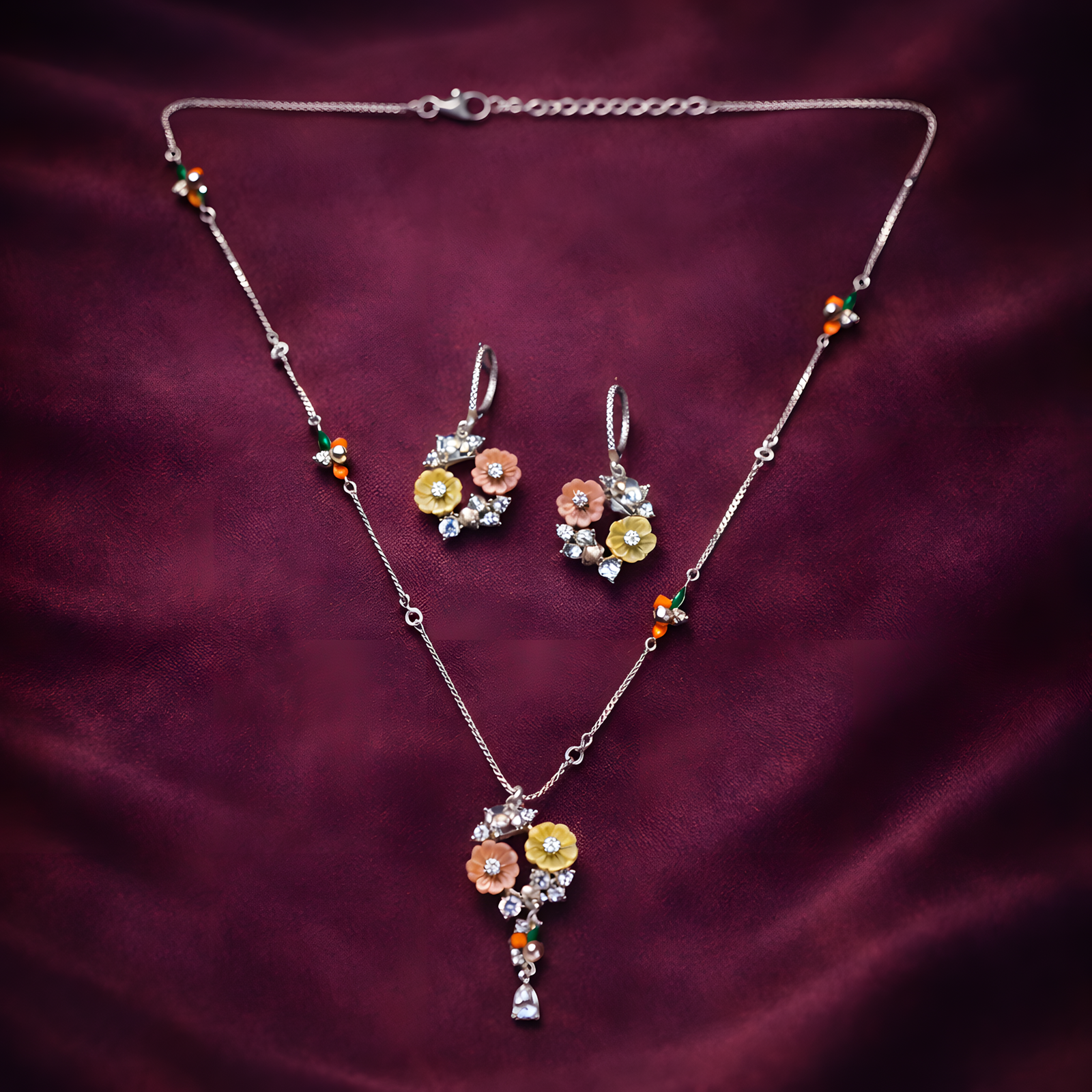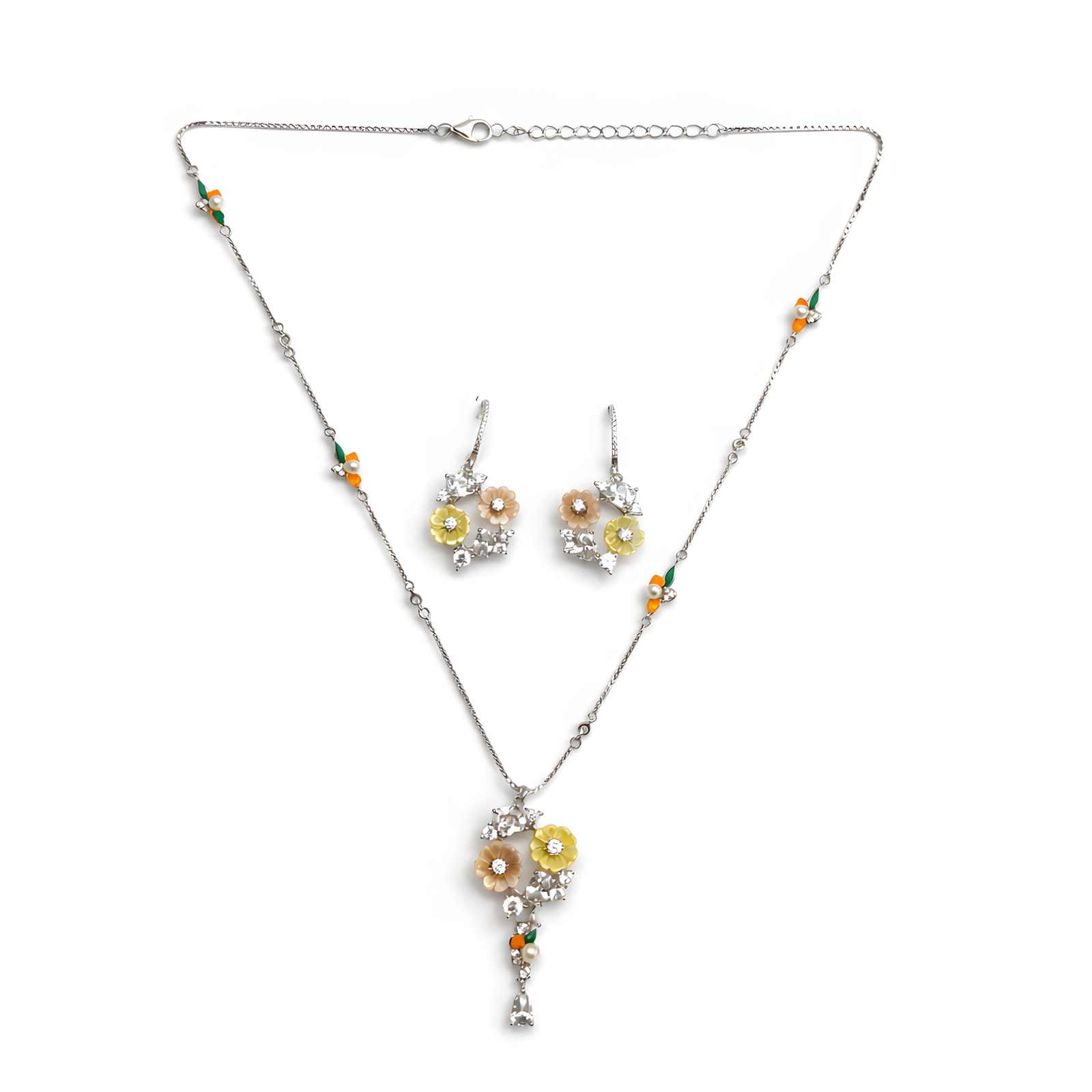 A charming silver necklace set featuring yellow and peach floral charms with delicate green accents.