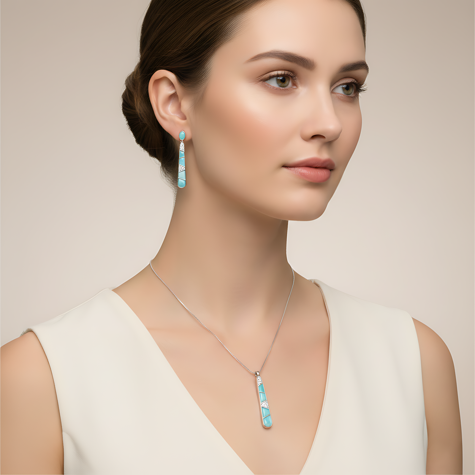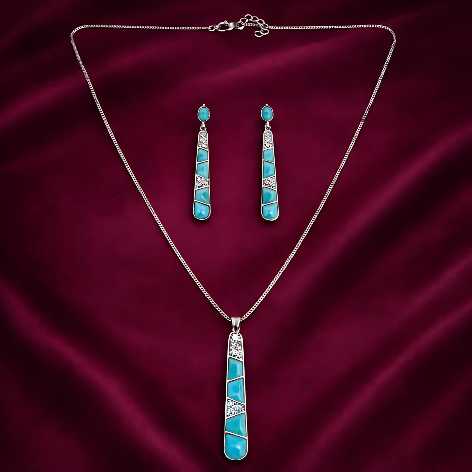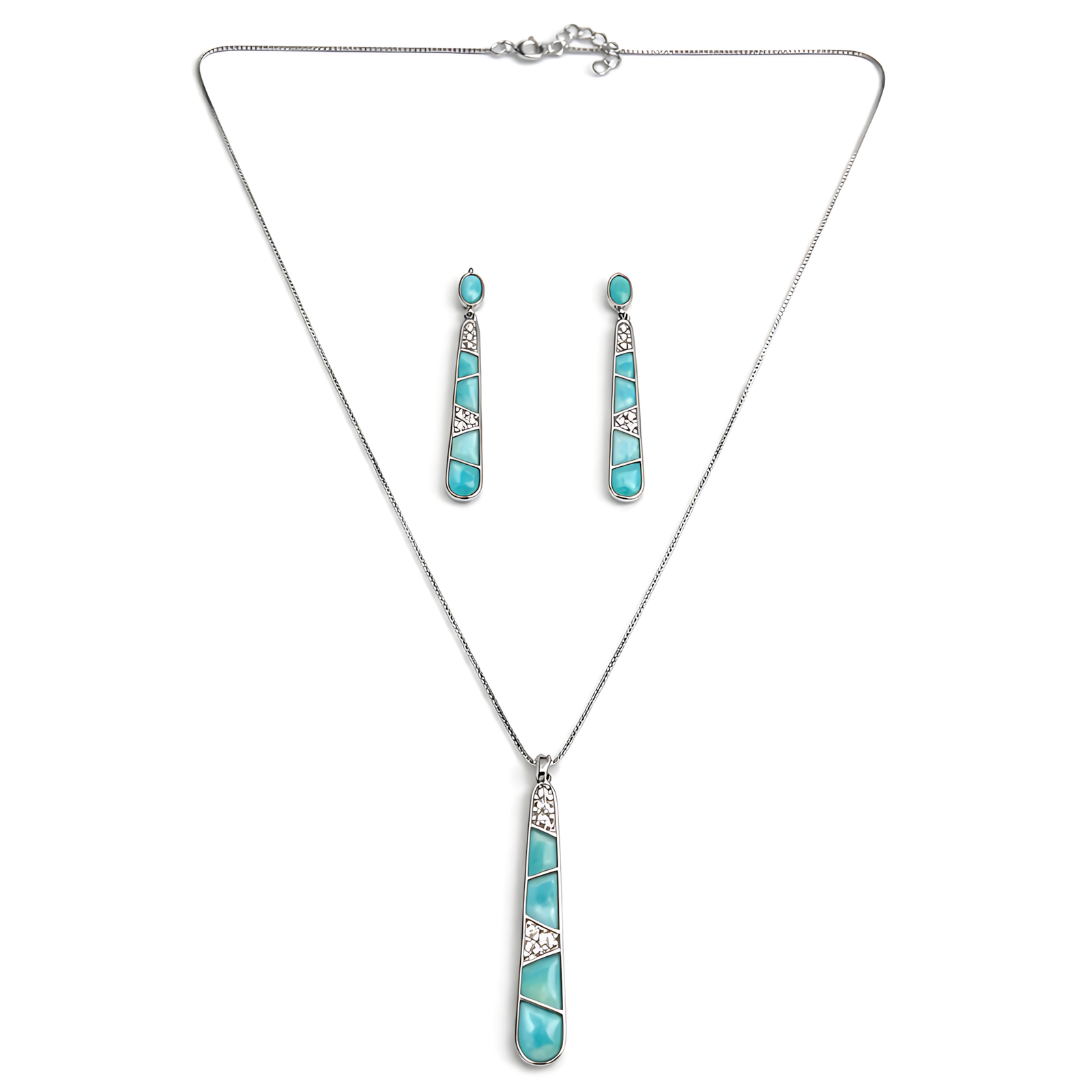 A sleek, modern necklace set featuring elongated drop pendants. The polished silver frames hold segmented sky-blue stones, creating a sophisticated vertical silhouette.